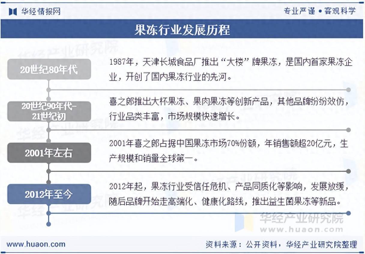 果冻行业于20世纪80年代在中国起步,初期发展缓慢,后喜之郎等品牌崛起,通过创新产品和广告营销推动行业进入快速发展和巅峰期。但近年来,因质量信任问题、市场竞争加剧等,行业发展遇阻,不过也在通过产品创新和升级寻求新的发展机遇。